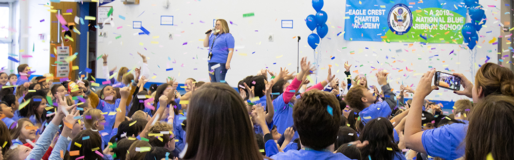Students and staff at Eagle Crest Charter Academy celebrating at their National Blue Ribbon School Award assembly.